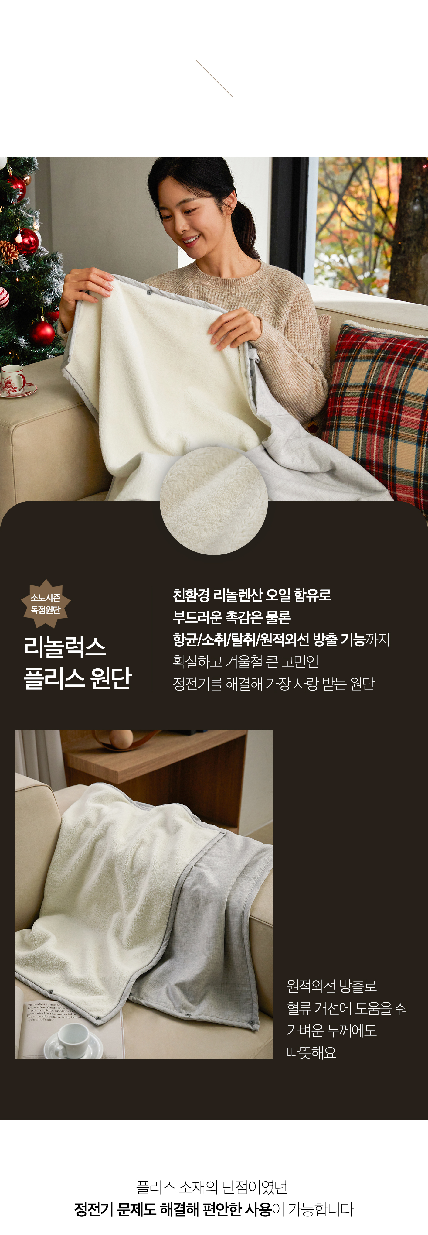| 제품 소재 | - 겉감(앞): 멜란 레이온 60% + 모달 40% - 겉감(뒤): 리놀럭스 플리스(폴리에스터 100%,리놀렌산 함유) |